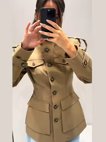 Pocket Stand Collar Long Sleeves Jacket Woman Single Breasted Solid Color Waist Cinching Jackets Versatile Women's New Jackets