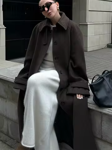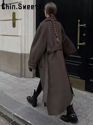 Elegant Brown Lapel Long Woolen Coats Women Stand Collar Hidden Single Breast Lace Up Coat 2025 Autumn Winter Lady Thick Jackets