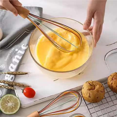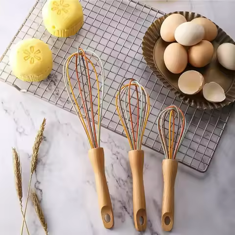 Kitchen Stainless Steel Whisk Creamer Semi-automatic Rotary Whisk Beech Wood Vase Handle Hand Mixer
