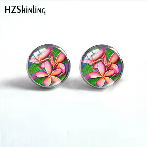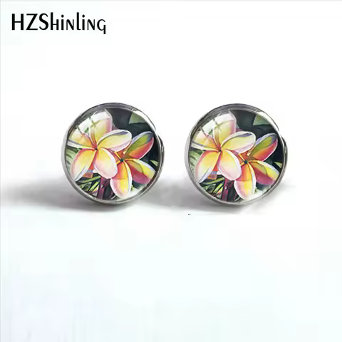 Hawaiian Plumeria Flower Paintings Stainless Steel Stud Earrings Glass Cabochon Ear Fashion Jewelry