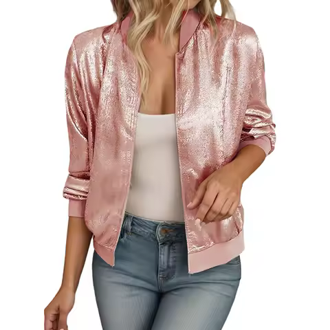Women Metallic Glitter Zipper Bomber Jacket Long Sleeve Lightweight Sparkly Concert Rave Party Jacket Casual Zip Coats Outwear