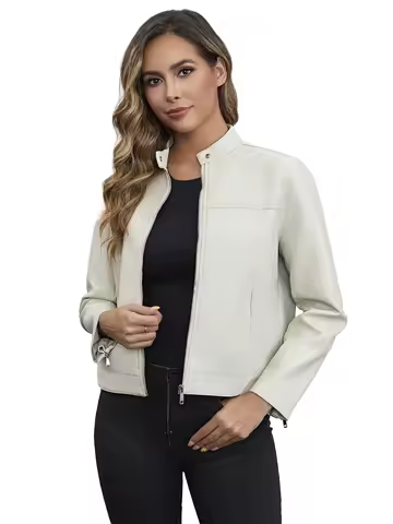 New Autumn Brown Women's Long Sleeves Leather Jacket, Black Stand-up Collar PU Coats, Off-white Coffee, Dark Blue Optional