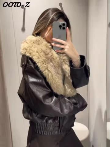 Stylish Fur Patchwork Leather Jacket Women Detachable Collar Double Breasted Waist Closed Coat 2025 Autumn Winter Lady Outwear