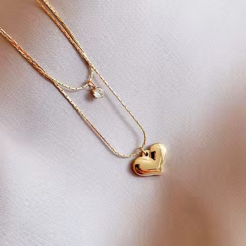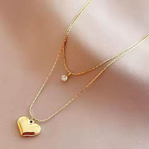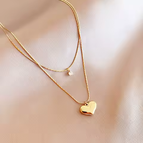 Stainless Steel 14K Gold Heart Pendant Necklace Women's Simple Chain Stylish Design Sense Jewelry Double Layer