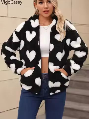 VigoCasey 2025 Female Autumn Print Jacket Women Single Breasted Thick Plush Warm Coat Winter Long Sleeve Loose Lady Soft Coat
