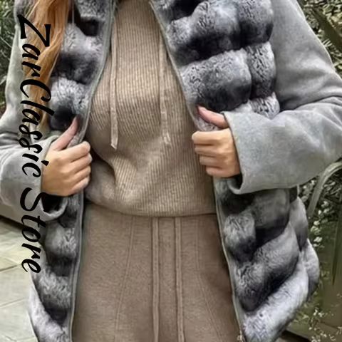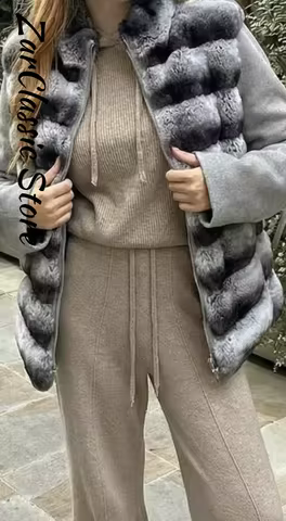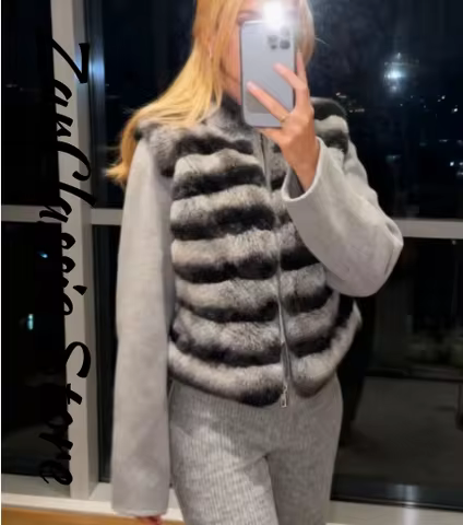 Warm Contrast Fur Patchwork Woolen Cutton Coats Stand Collar Zipper Full Sleeve Quilted Jackets 2025 Winter Lady Casual Outfit