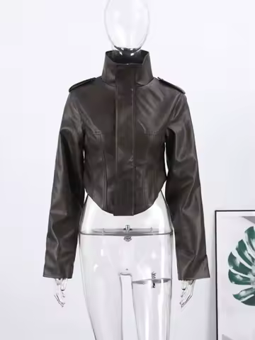 Vintage Women's Cropped Faux Leather Jacket Stand Collar Balloon Sleeve Biker Style PU Leather Coat Streetwear Fashion Outfit