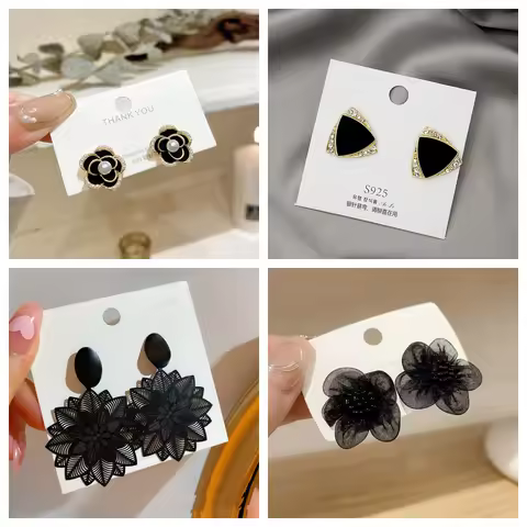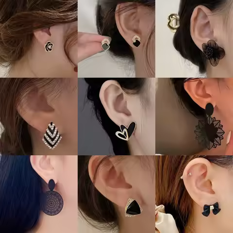 Classic Black Flower Earrings for Women Crystal Rhinestones Geometry Round Hollow Triangle Bow Star Moon Love Heart Jewelry Gift