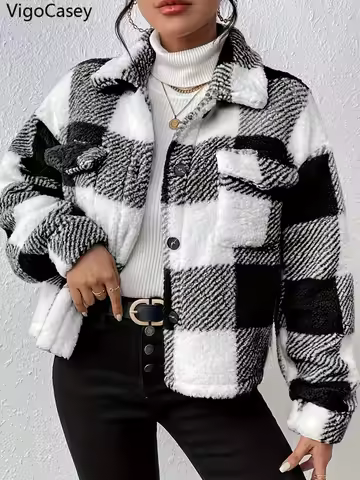 VigoCasey 2025 Autumn Women Plaid Print Jacket Thick Plush Warm Print Long Sleeve Coat Winter Loose Turndown Collar Lady Coat