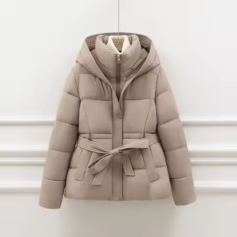 2026 New Winter Jacket Women Warm Parkas Long Sleeve Tops Casual Cotton Padded Jackets Belt Black Brown Hooded Outwear Female