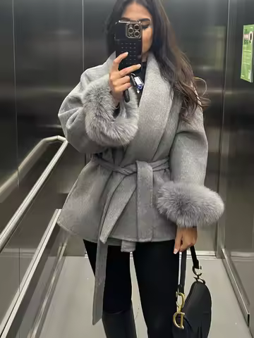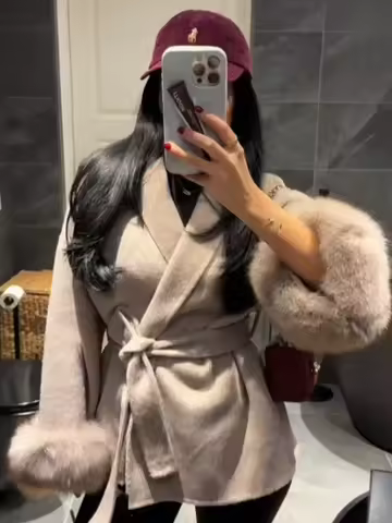 Fashion Belted Waist Woolen Short Coat For Women Elegant Lapel Faux Fur Cuffed Sleeve Jacket Lady Autumn Winter Chic Outerwear