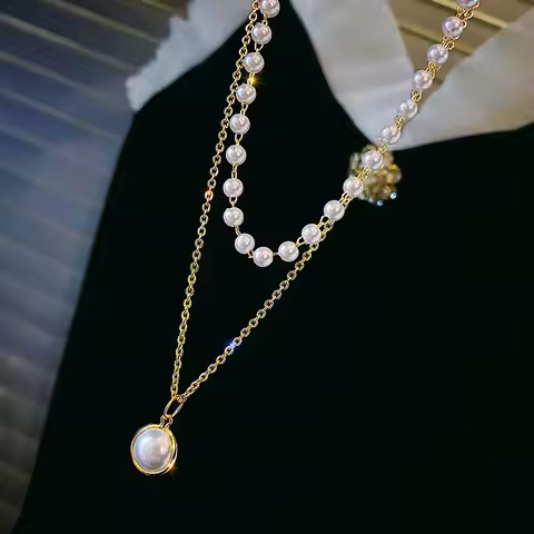 Gold Plated Pearl Necklace Adjustable Double Layer Dainty Chain Pendant Delicate Jewelry for Mother's Valentine Birthday Gift