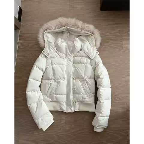 Y2K American Retro Fluffy Fur Collar Hooded Cotton Coat Women Solid Cream Winter Warm Slim Casual Jacket