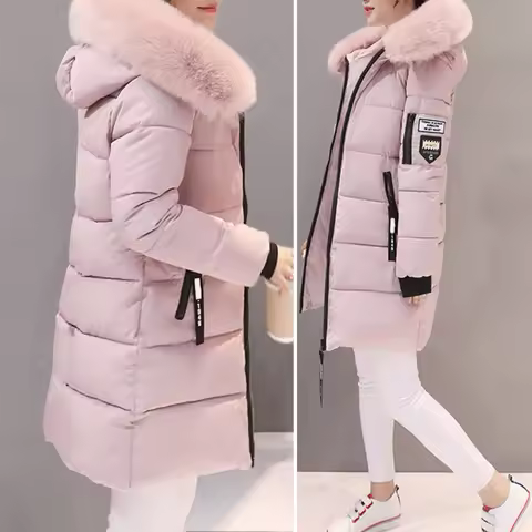 Fashion Women Winter Cotton Coat Parka Thickened Padded Stuffed Hooded Mid Length Warm Zip Up Slim Lady Down Coat Long Overcoat