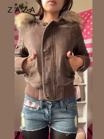 Vintage Brown Fur Collar Hooded Jacket For Women Slim Fit Long Sleeve Pocket Coat 2025 New Female Autumn Winter Solid Streetwear