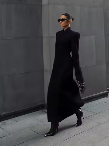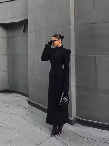 Elegant Solid Woolen Women's Long Coat Fashion High Neck Wide Shoulder Long Sleeve Jacket Autumn Winter Lady Outerwaer Street