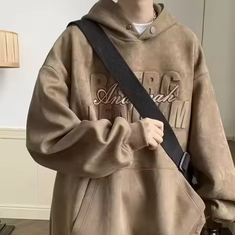 Autumn Letter Printed Suede Pullover Hoodies For Men New Hip Hop Fashion Retro Loose Hooded Sweatshirts Y2K Streetwear Hoodie
