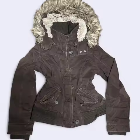 Winter Fashion New Solid Color Fur Collar Hooded Cotton-padded Jacket Women Y2K Street Vintage Pop College Cotton-padded Jacket