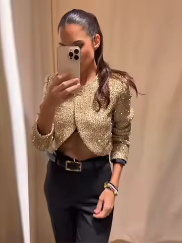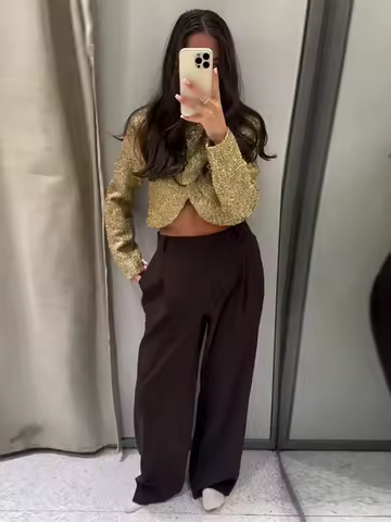 Gold Lurex Women's Short Jacket O Neck Single Button Long Sleeve Irregular Coat 2025 Autumn Winter Lady Chic Street Outerwear