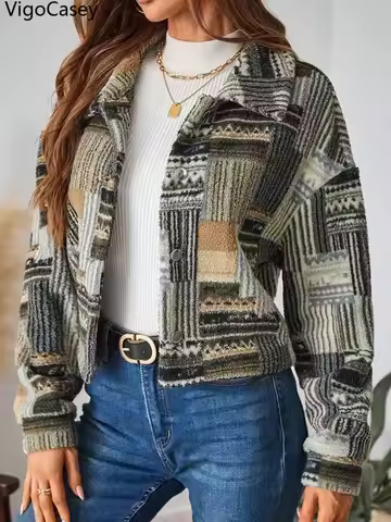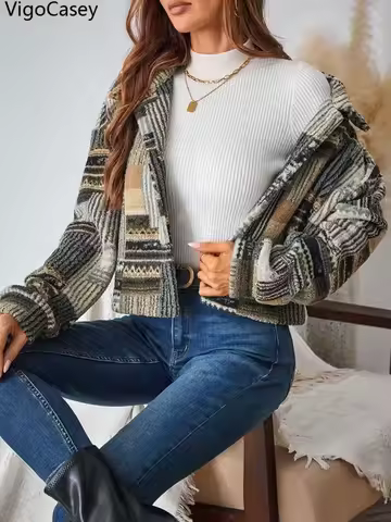 VigoCasey 2025 Women Autumn Winte Print Jacket Casual Long Sleeve Thick Plush Warm Coat Zipper Lady Short Thick Furry Coat