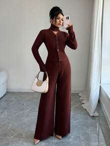 SHEIN Elenzya Women's Solid Color Ribbed Knit Set, High Neck Collar V-Neck Single-Breasted Cardigan And Wide Leg Pants 3-Piece Vintage Outfit