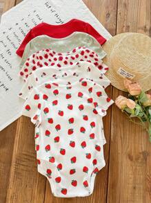 SHEIN LMoss Kids 5-Piece Set Newborn Baby Girl Summer Cute Knit Ditsy Floral Polka Dot Cartoon Print Short Sleeve Bodysuit