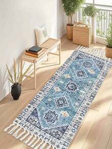 1pc Blue Patterned Decorative Rug, Bohemian Style Woven Non-Slip Rectangular Area Rug With White Tassels, Easy To Clean Small Rug Suitable For Kitchen, Laundry Room, Game Room, Farmhouse, Patio, Balcony, Porch And Office, All-Season Indoor Outdoor Durable Doormat, Autumn/Winter Decor, Home Decor, Holiday Gift