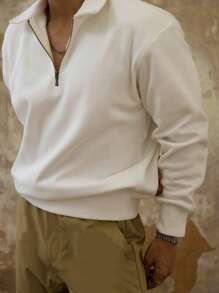 Men's Autumn/Winter Half Zip Polo Collar Quarter Zip Sweatshirt, Loose Fit Casual Solid Color Retro Sports Pullover